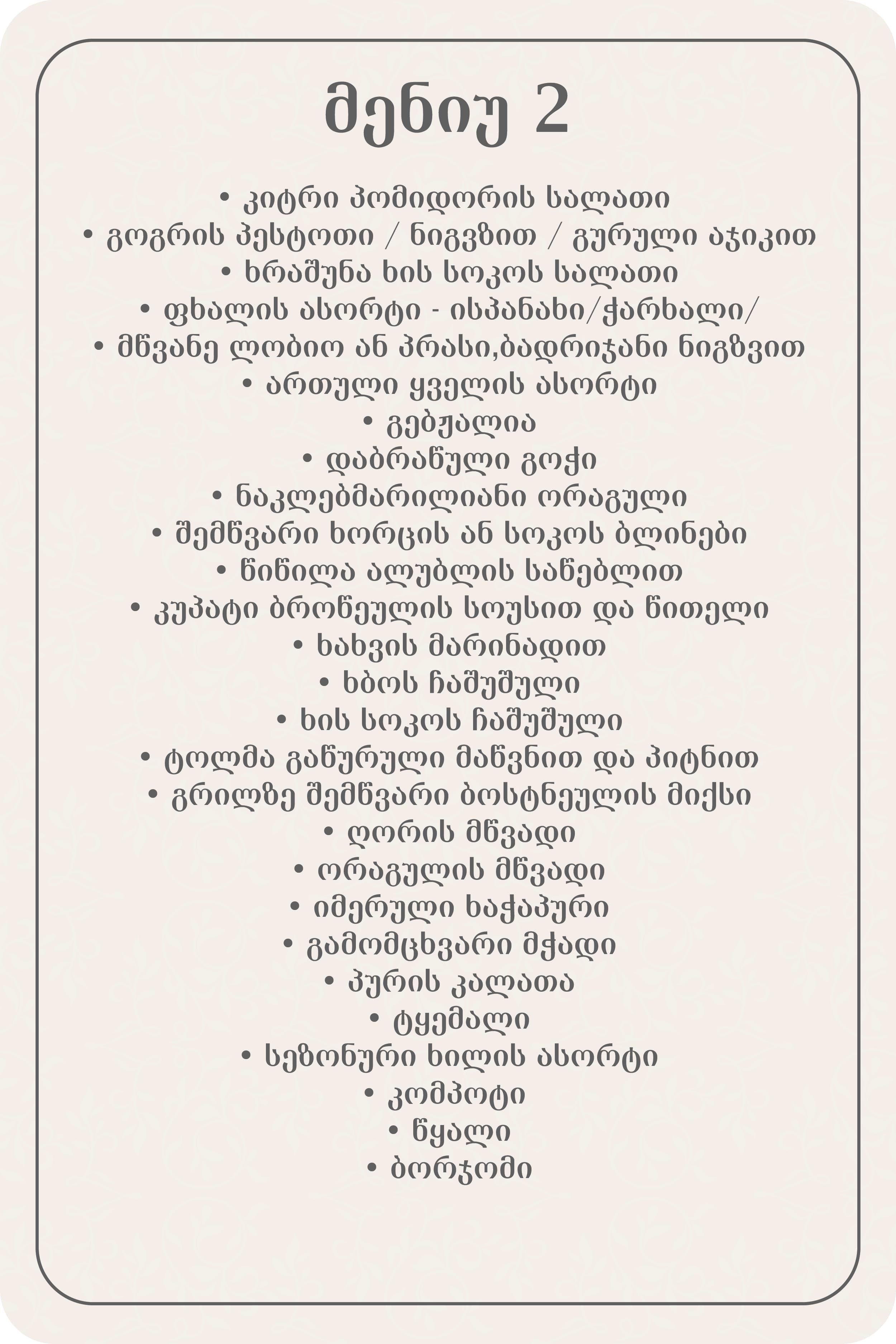 „გთავაზობთ მრავალფეროვან მენიუს, რომელიც მოიცავს როგორც ტრადიციულ, ისე თანამედროვედ სახეცვლილ და დახვეწილ კერძებს“
